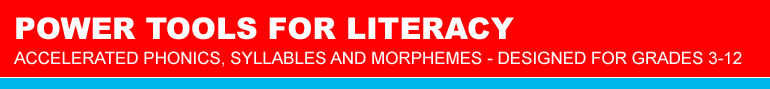 Power Tools for Literacy targets the problems of struggling readers, students with learning differences or dyslexia, and English learners. Based on Orton Gillingham principles, Power Tools for Literacy consists of 300 systematic, multisensory lessons that sustain motivation and bring about rapid improvement in reading, spelling, and vocabulary. Become an expert in teaching phonics, syllable patterns, syllabification rules, as well as Anglo-Saxon, Latin and Greek morphemes.